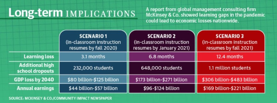 Amid the COVID-19 pandemic, learning loss that began as early as March 2020 could affect students down the road. A study from global management consulting firm McKinsey & Company estimates an additional 232,000 high-school dropouts may be among the group of U.S. students who returned to in-person classrooms in September.