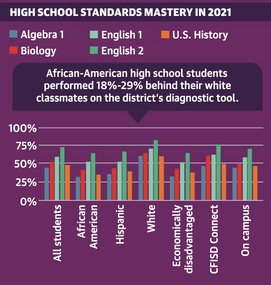 Fifty-five percent of CFISD’s enrollment is classified as economically disadvantaged, and most are students of color—45% are Hispanic and 19% are African American, according to the district.